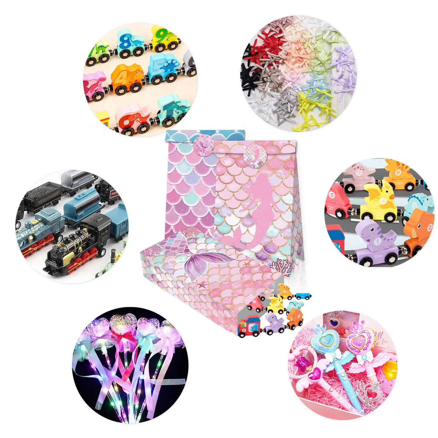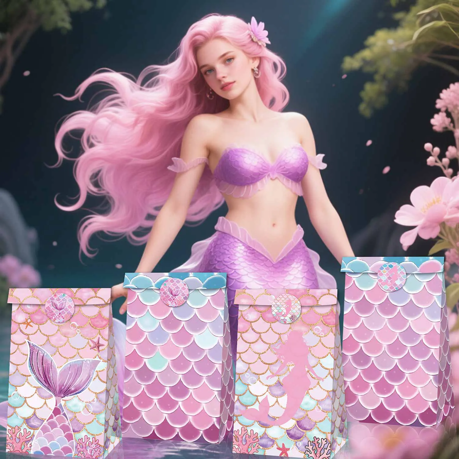 완벽한 수중 장식: 이 가방의 주요 색상은 보라색, 분홍색, 파란색 및 민트 그린으로, 소녀들의 파티를 위한 가장 귀여운 색상 조합입니다. 그들은 인어를 테마로 한, 수중 테마 또는 다른 바다를 테마로 한 파티에 특별한 감각을 추가하도록 설계되었습니다.