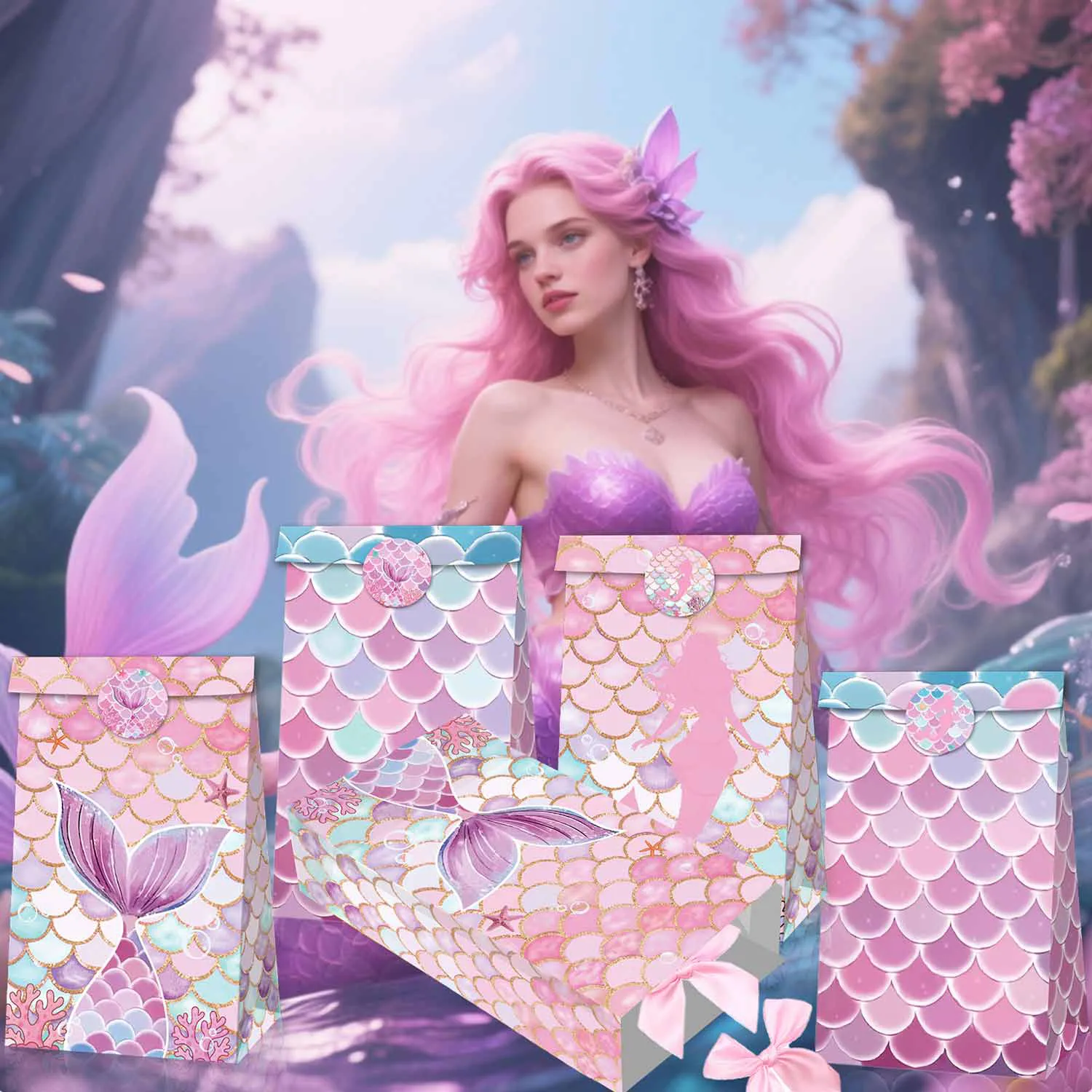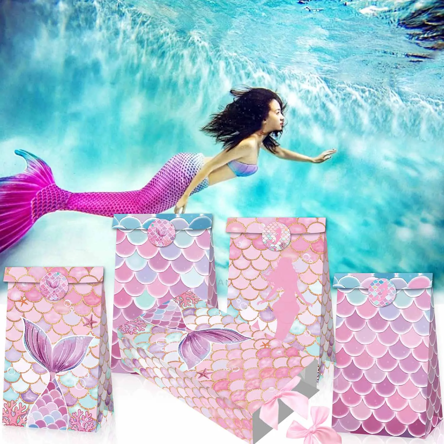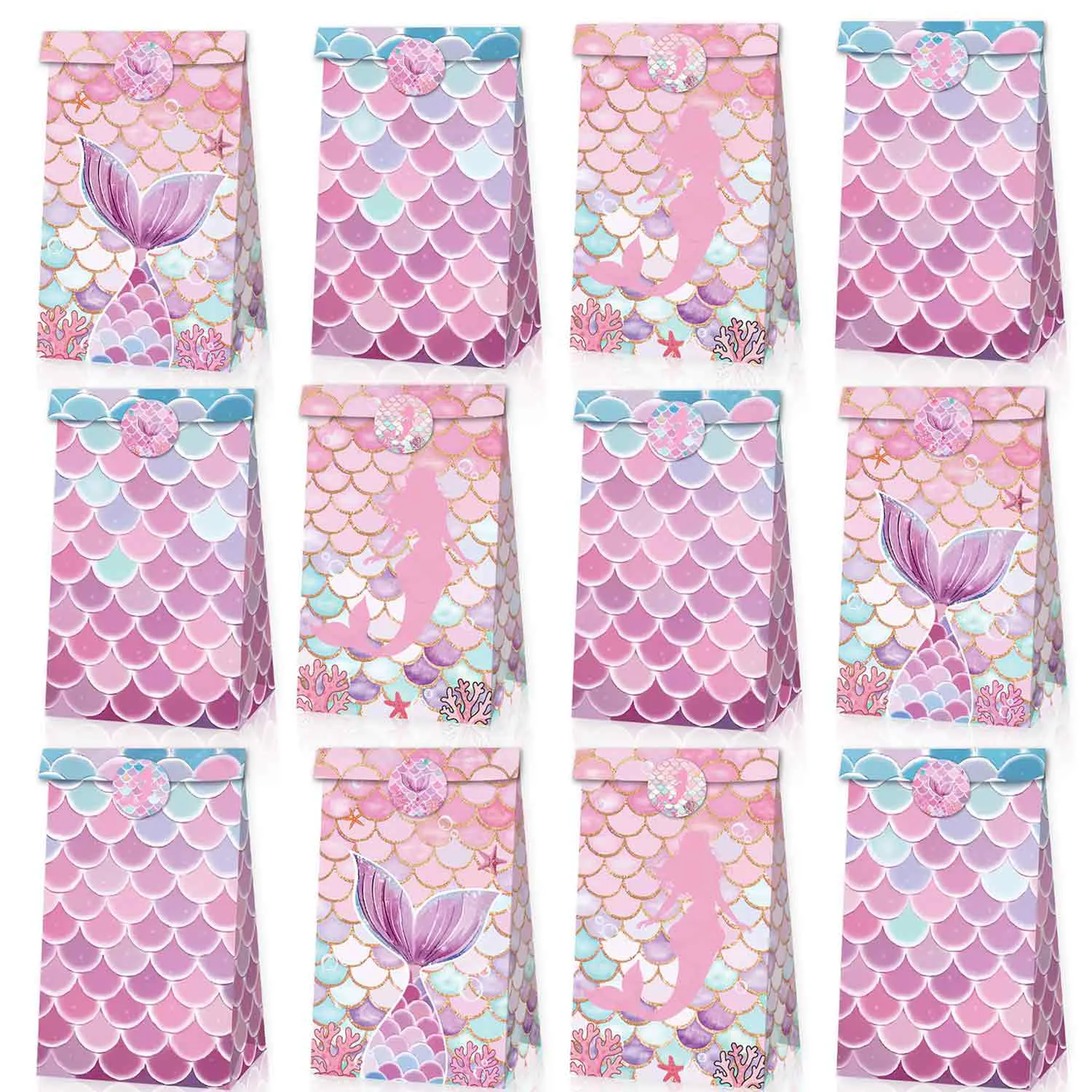 지린 12 PCS 인어 패턴 종이 가방, 꼬리 디자인이 있는 핑크 및 블루 스케일 패턴, 선물 가방, 구디 가방, 전리품 가방, 크래프트 종이 가방