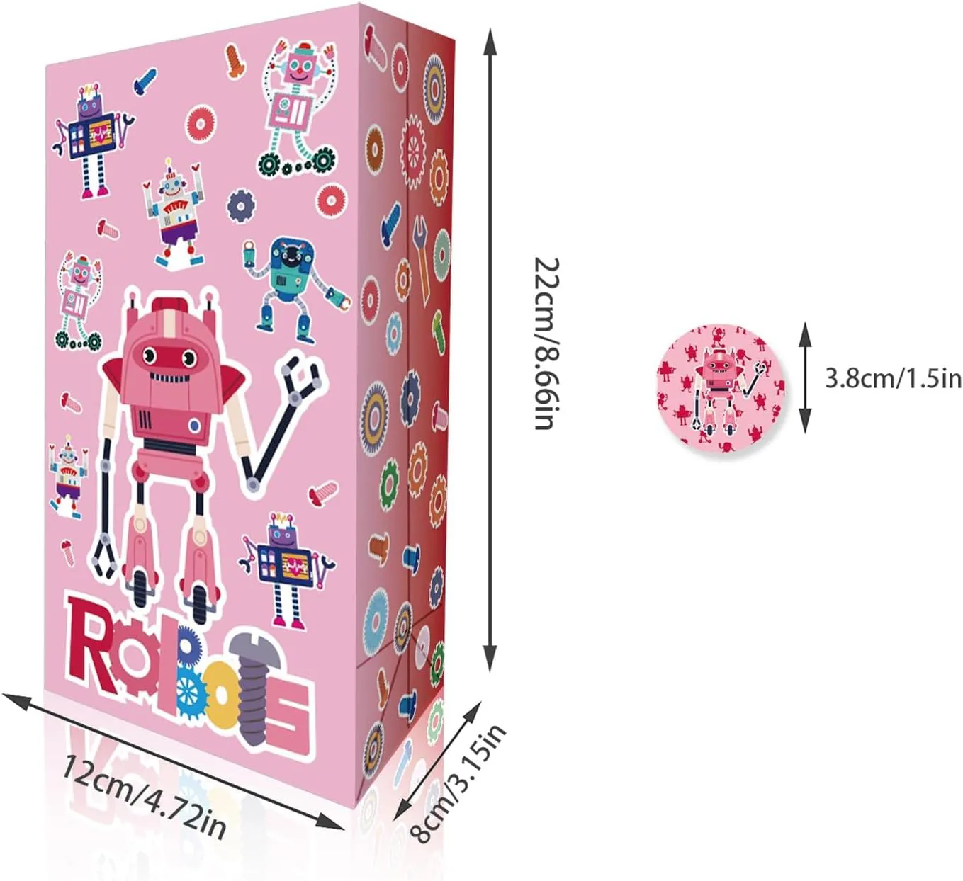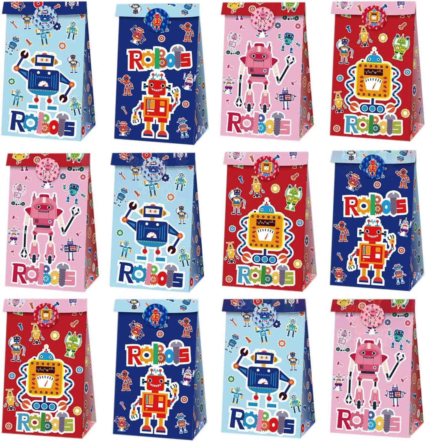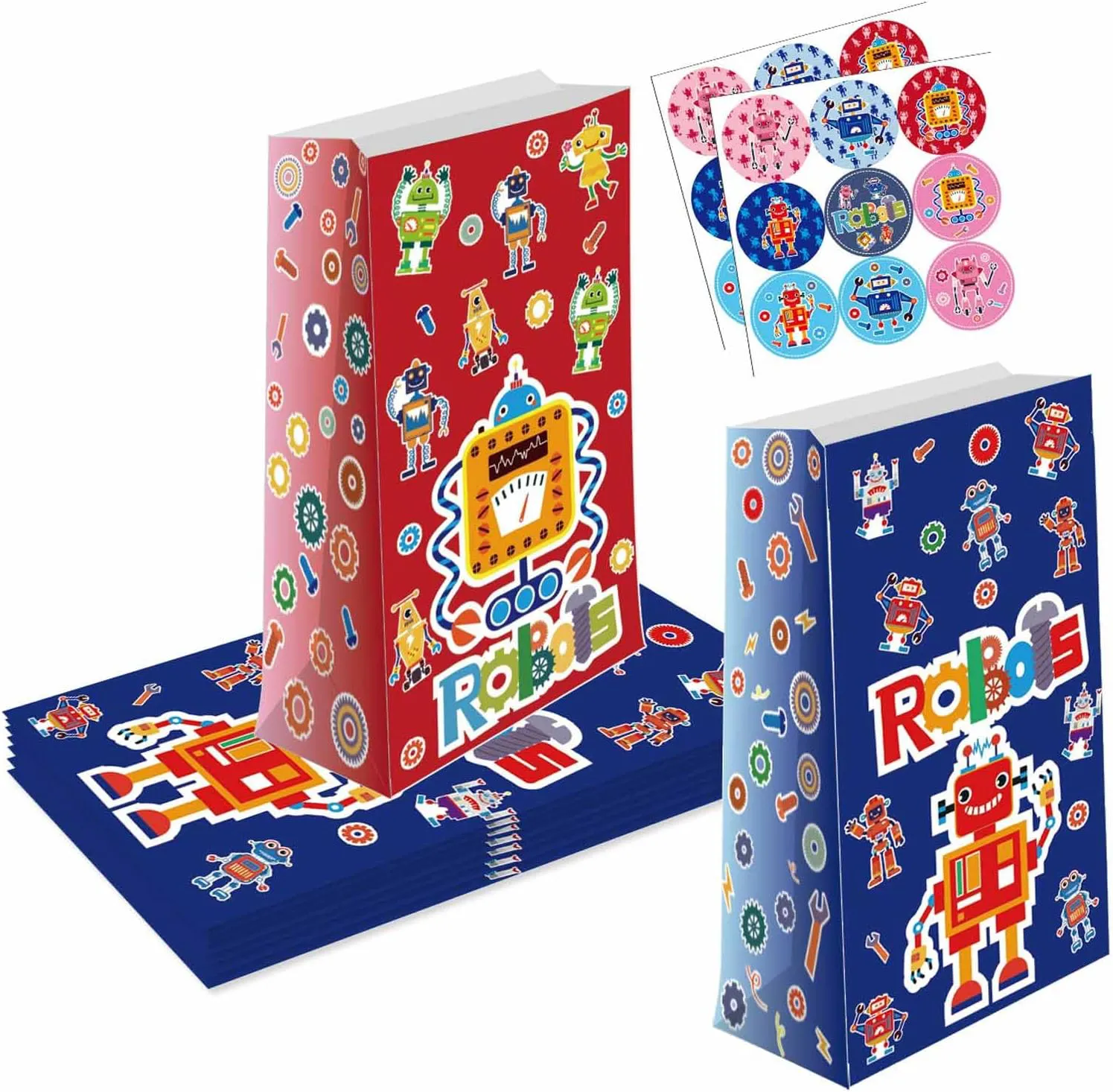 포장: 크래프트 종이 가방 12개와 귀여운 스티커 18개를 포함하여 재미있는 로봇 패턴 선물 종이 가방을 구입하십시오.