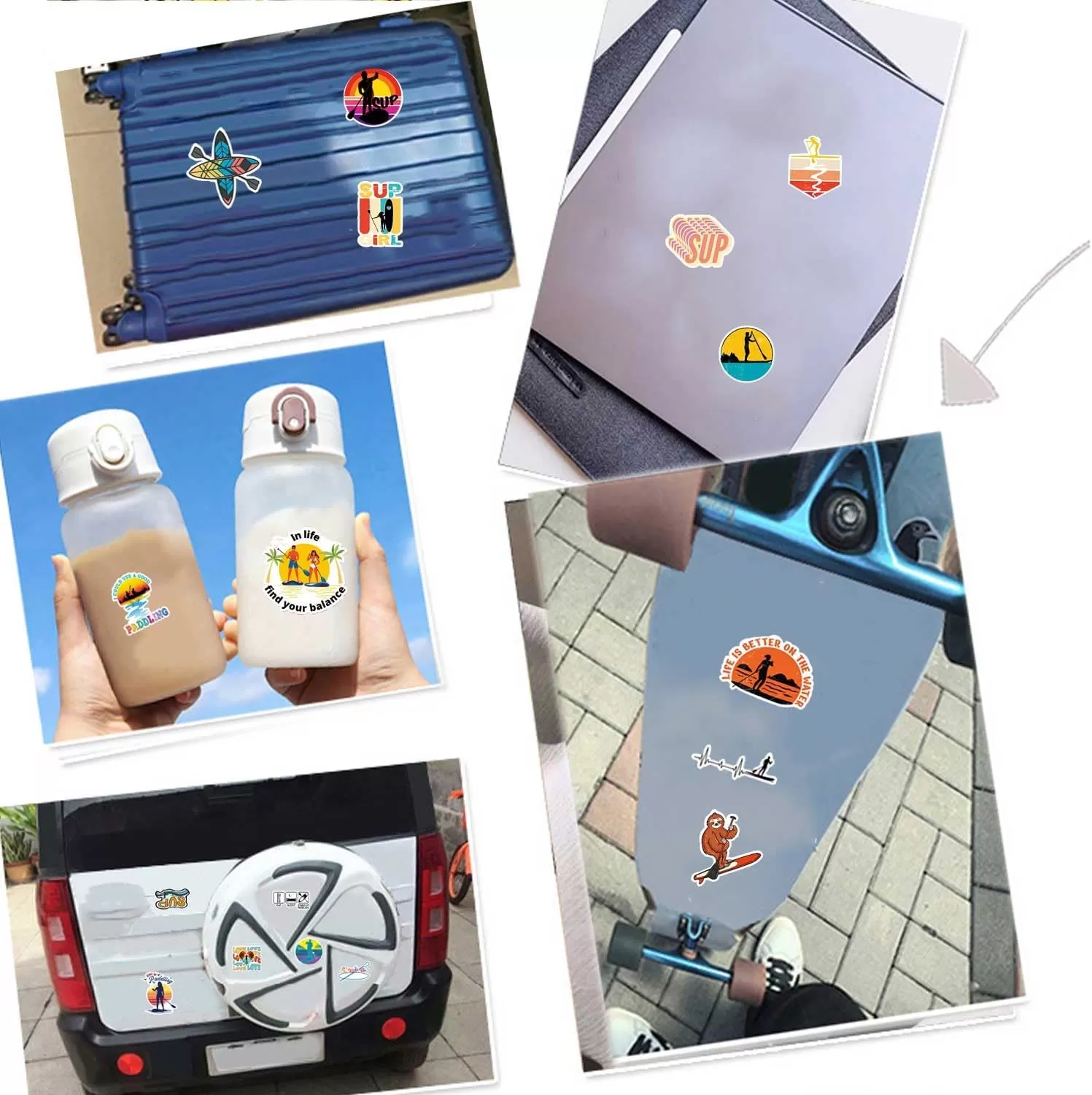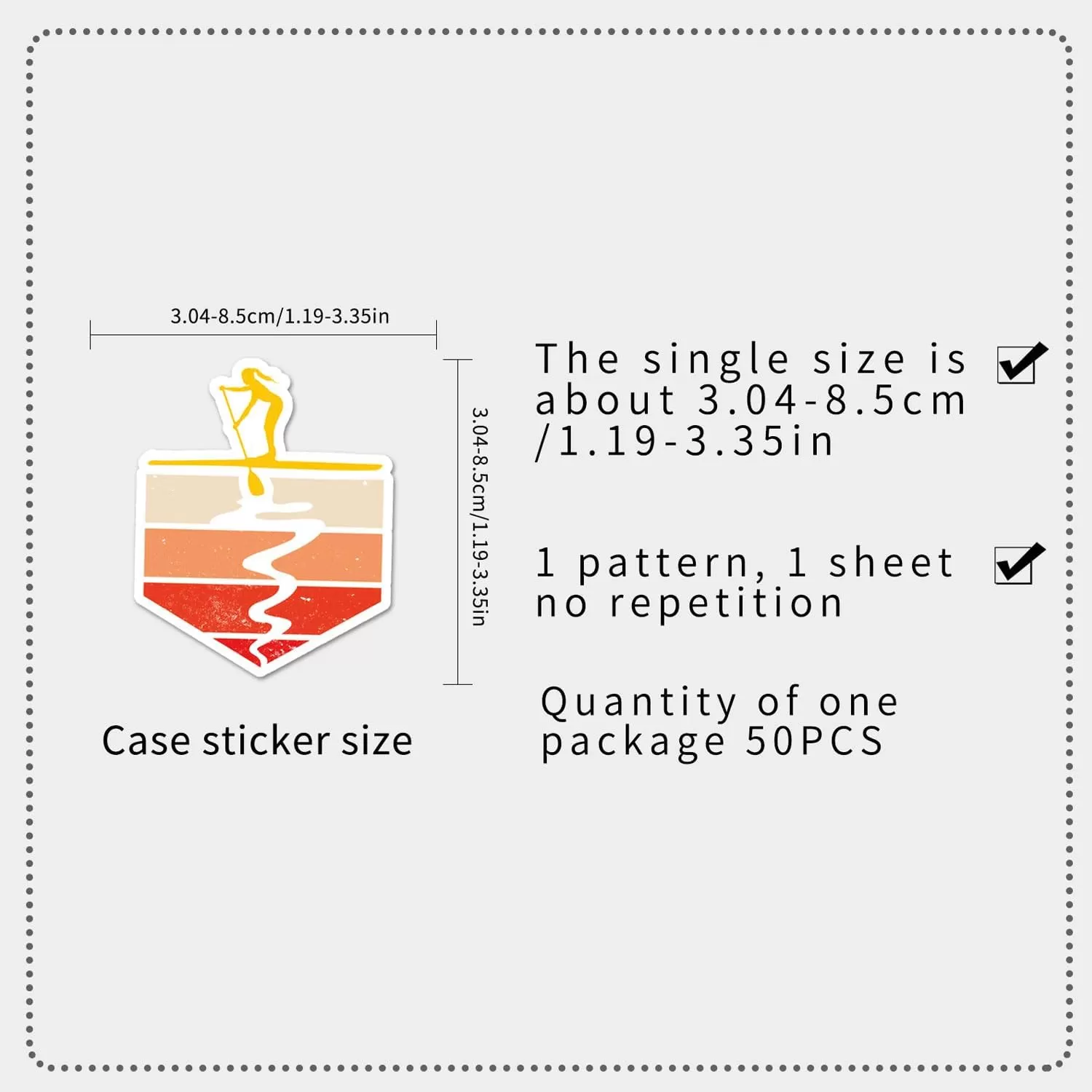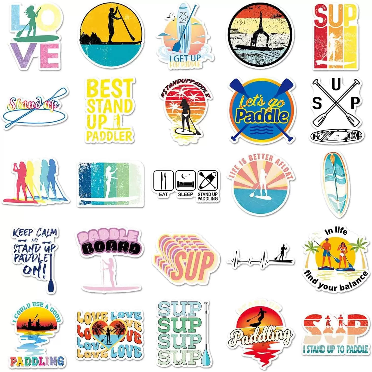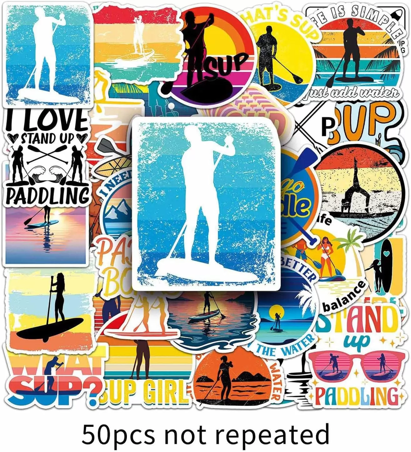 제품 포장: 총 50개의 다양한 스탠드업 패들보드 스티커로, 반복되는 패턴이 없고 적당한 크기의 독특한 디자인이 특징입니다.